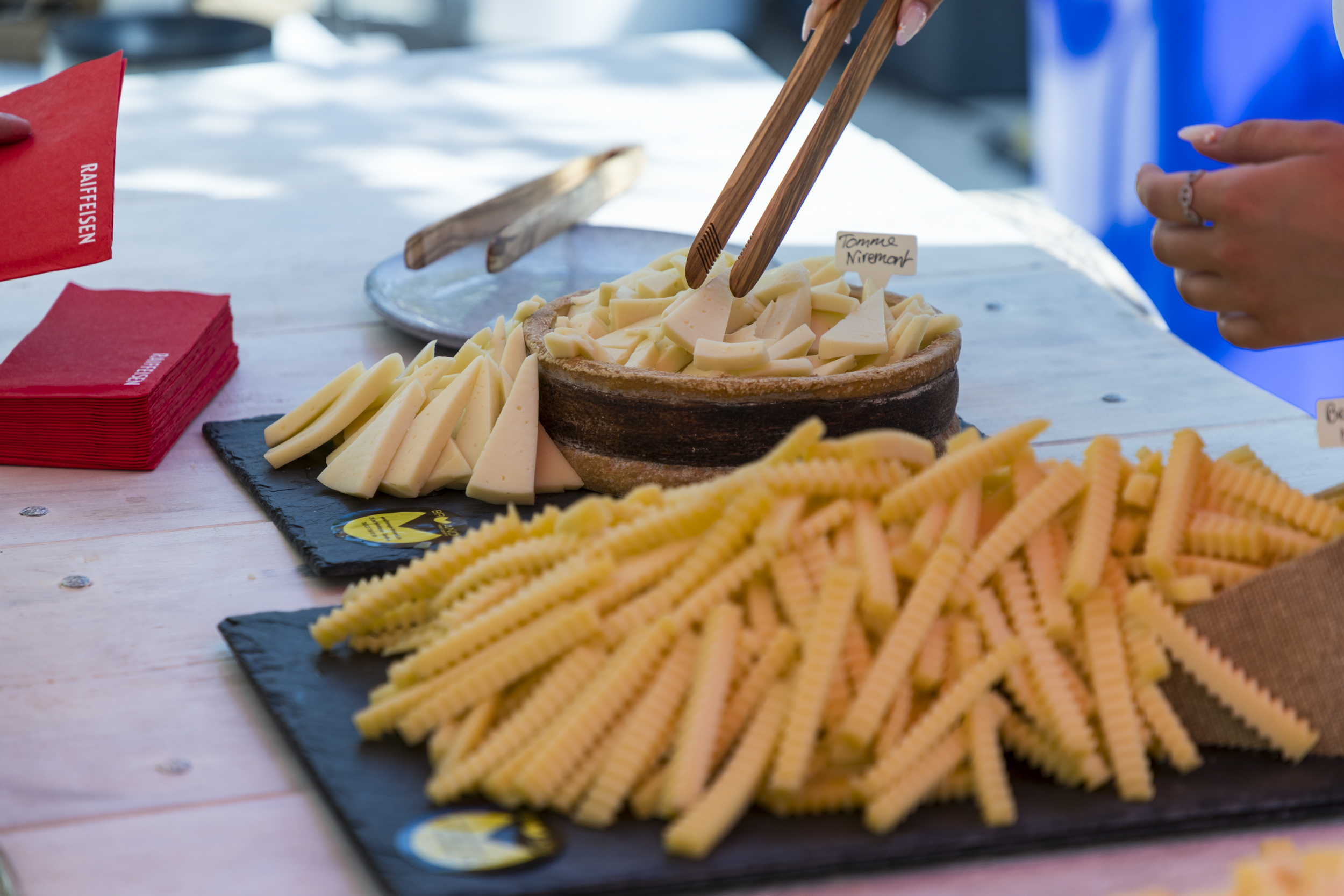 Hroki a imaginé une fête de village contemporaine, inspirée du terroir genevois. Le concept s’est articulé autour d’un marché estival éphémère, avec quatre stands de dégustation mettant à l’honneur les produits locaux : fromages, charcuteries, vins du Mandement et fruits secs & chocolats.